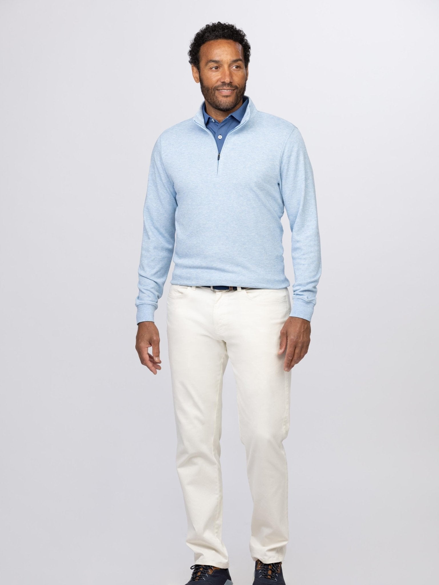 Made from soft heathered performance yarn, this quarter zip delivers lightweight warmth with a clean, tailored feel. Designed to layer easily without bulk, it offers polished comfort that moves naturally through everyday wear, travel, and cool weather outings.